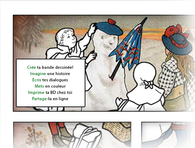Voici l’atelier de bande dessinée. Tu as carte blanche pour créer ta propre bande dessinée à partir des œuvres de l’exposition.